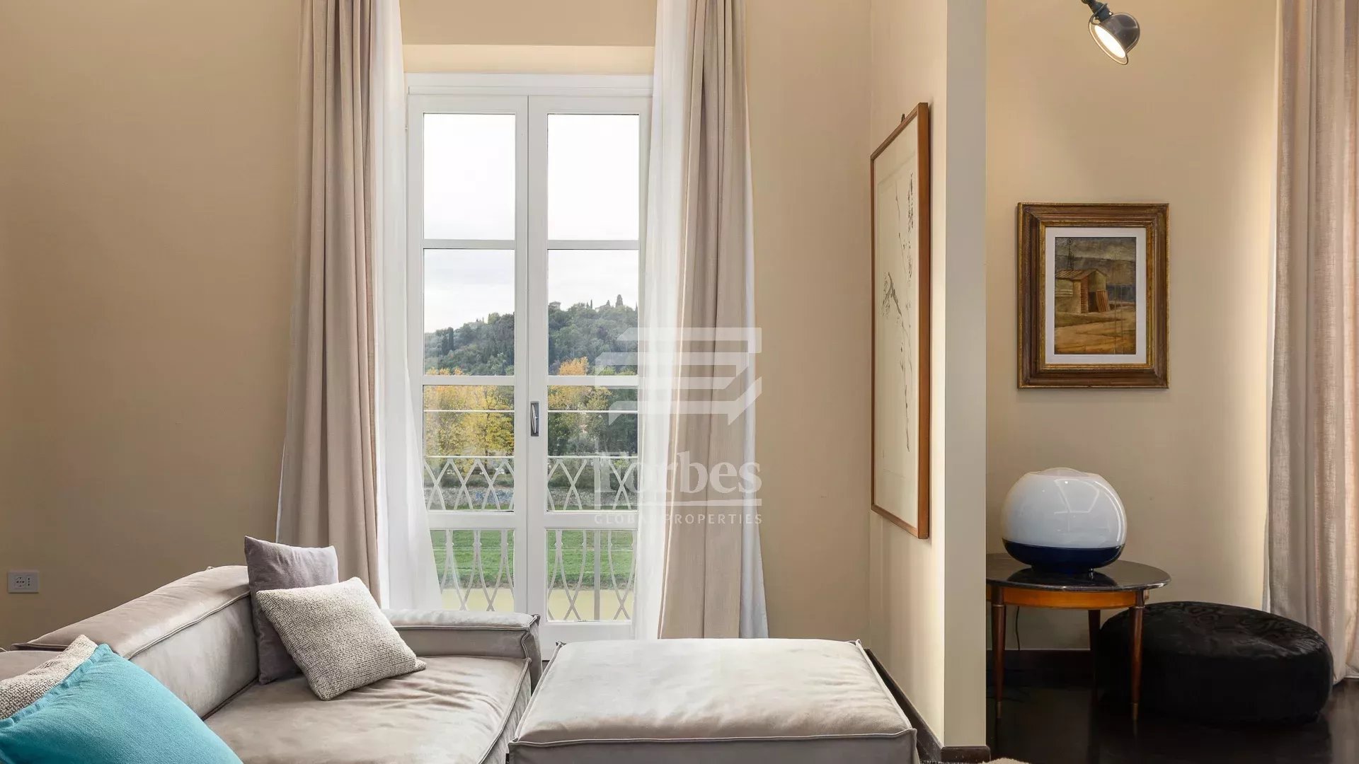 L’ingresso, arricchito da armadiature su misura, conduce alla luminosa zona giorno, composta da un ampio doppio soggiorno e una sala da pranzo, entrambi con accesso diretto alla terrazza panoramica. La cucina moderna, completamente attrezzata, dispone anche di un pratico ingresso di servizio. La zona notte, sapientemente separata dagli spazi living per garantire privacy, è composta dalla master suite con vista sul fiume, caratterizzata da mobili artigianali su misura e dettagli curati, una seconda camera doppia con bagno en suite e cabina armadio, oltre a due ulteriori stanze spaziose. La proprietà comprende tre bagni di pregio in marmo di Carrara e una lavanderia separata e attrezzata.