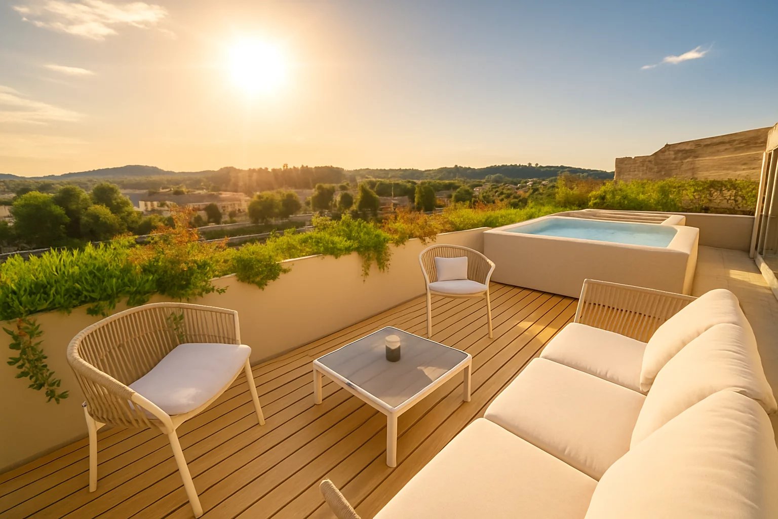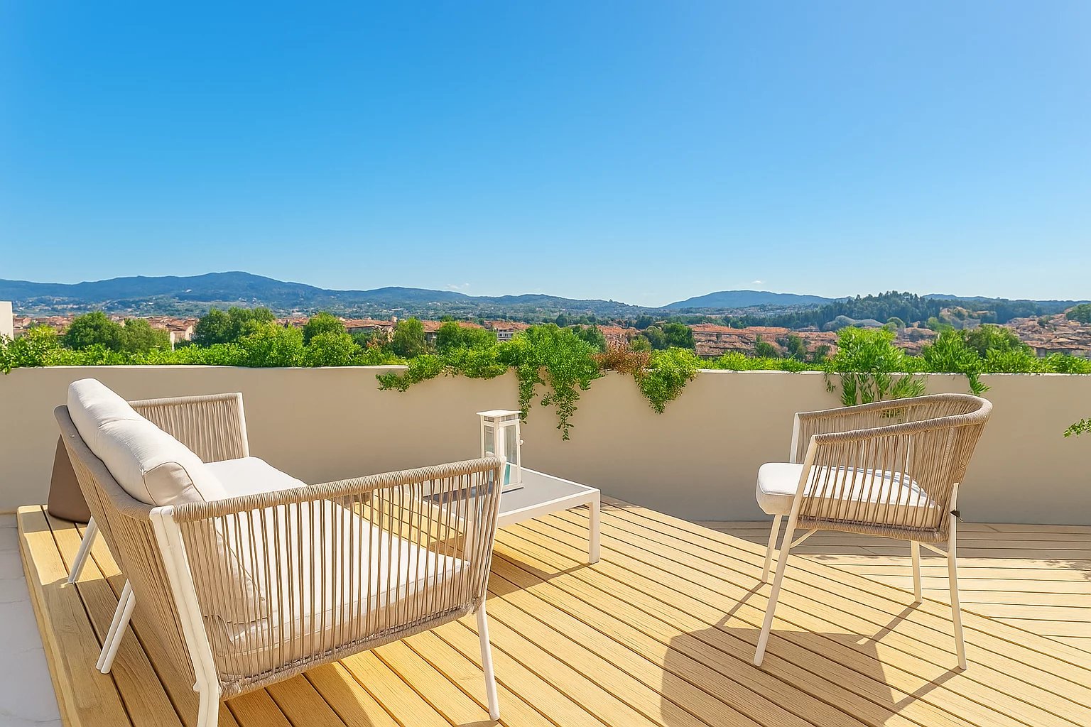 The apartment is equipped with modern conveniences including electric shutters and a reliable alarm system for your peace of mind. An elegant lift ensures easy access to each floor, emphasizing comfort and convenience. The outdoor space boasts breathtaking views, making it a serene retreat.