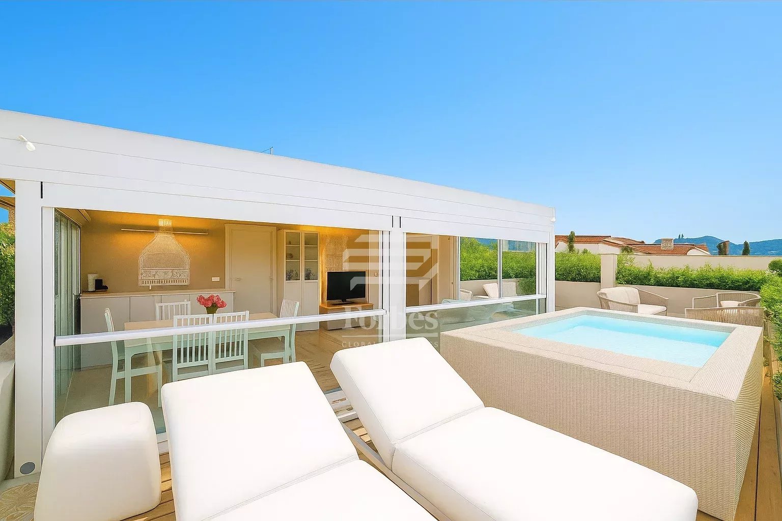 À l’extérieur, une piscine privée vous attend pour des moments de détente ensoleillés. Le grand balcon vous permet de profiter pleinement des vues panoramiques sur la ville. Cet appartement est une véritable oasis de luxe au cœur de l’Italie, parfait pour les amateurs de confort et de style.