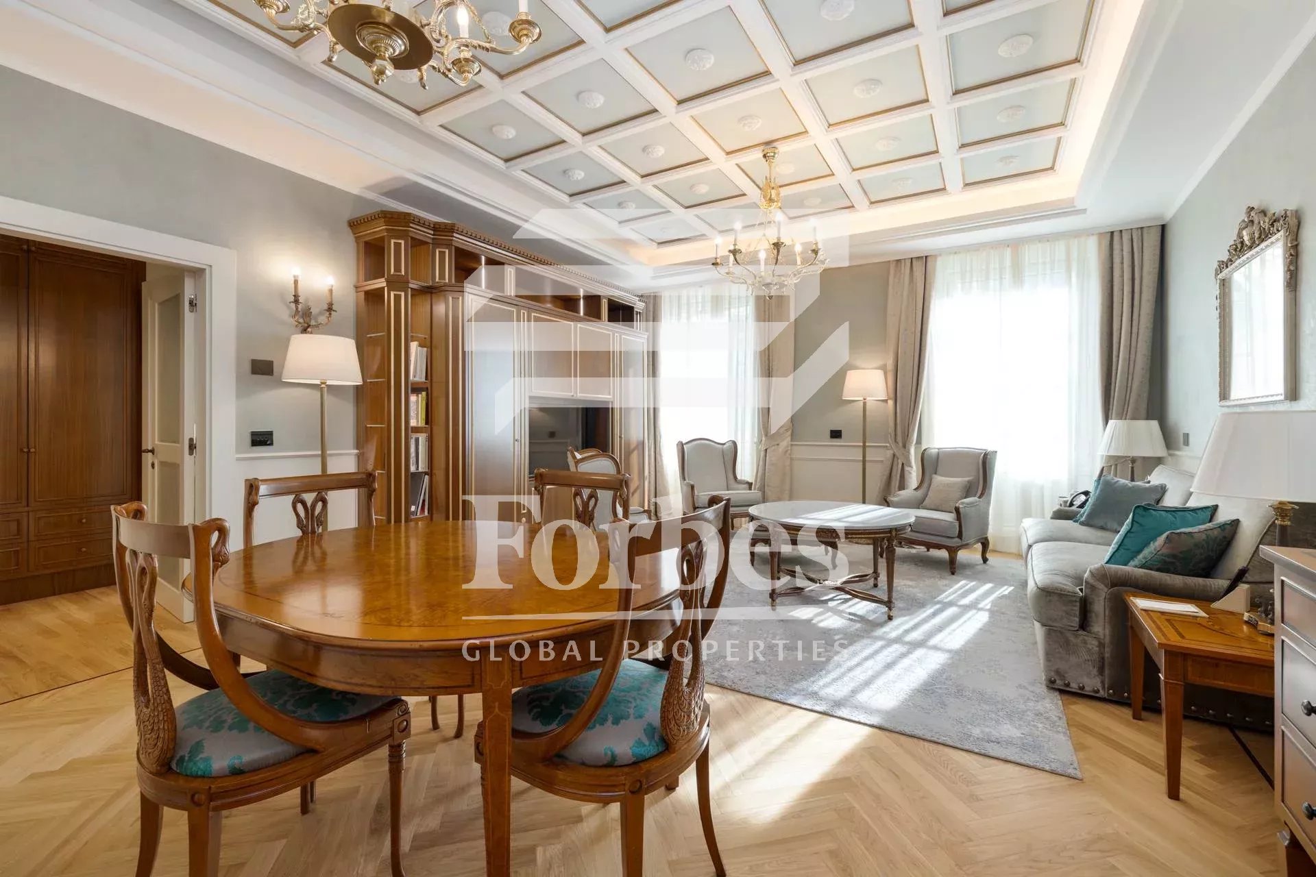 This exclusive apartment for sale, completely renovated and furnished, is located on the third floor and covers an area of 136 square meters. The residence consists of a bright living area with kitchen and dining area, two bedrooms, and two bathrooms. High-quality materials and finishes characterize the spaces, offering comfort and elegance.