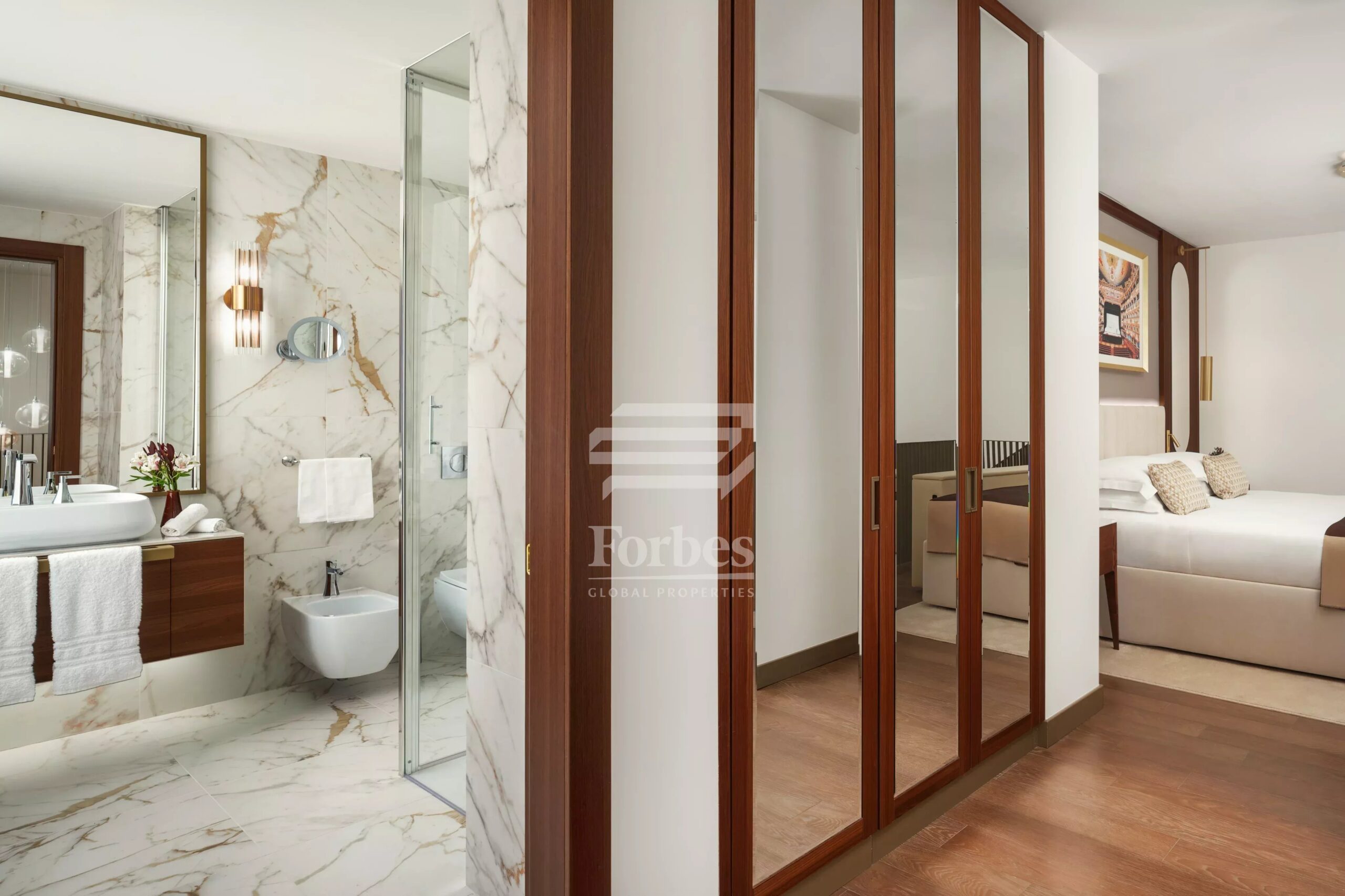 On the upper floor, the sleeping area opens up with the bedroom and en-suite bathroom, which are distinguished by high-quality furnishings and detailed finishes, offering an intimate and refined environment.