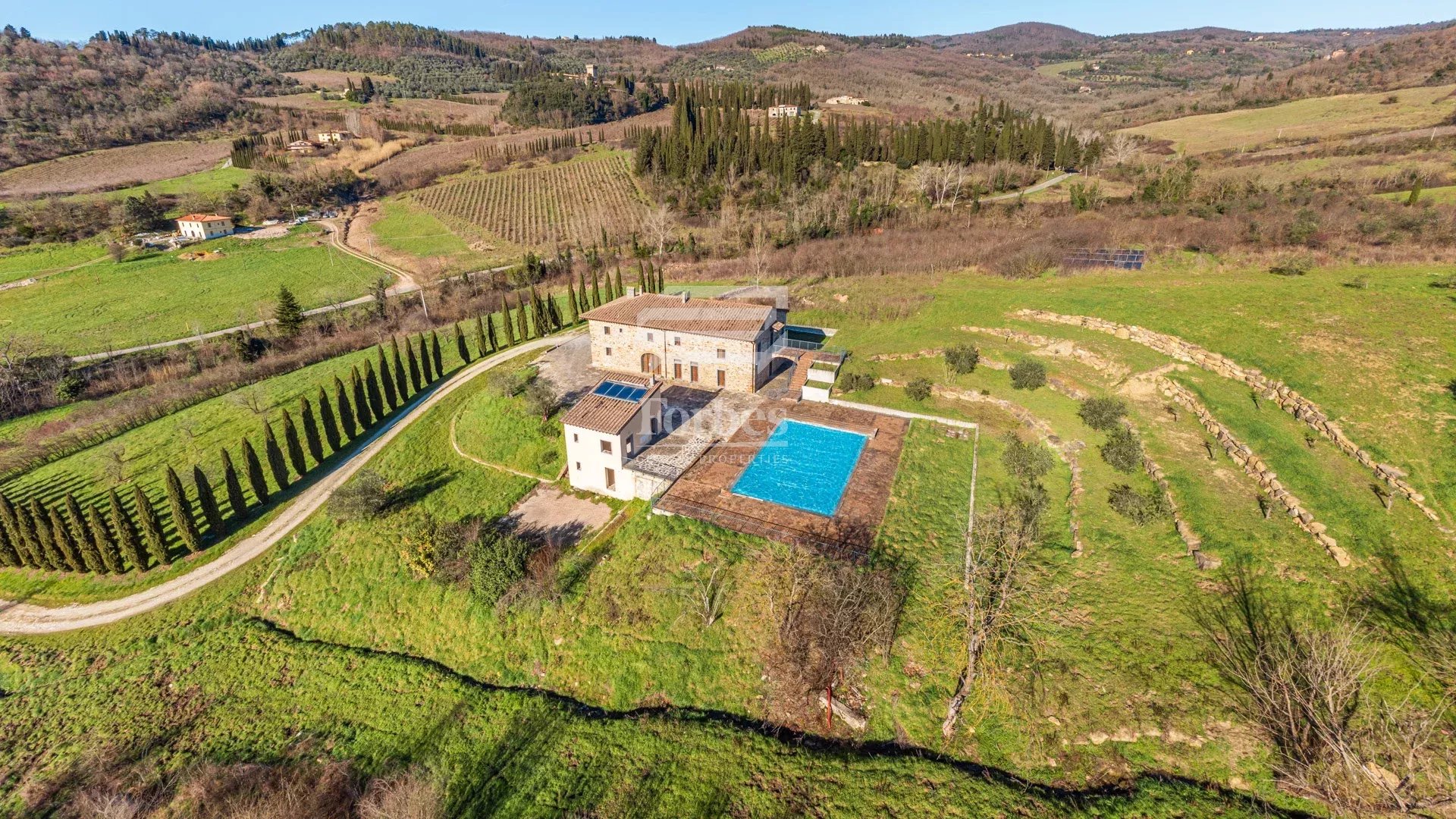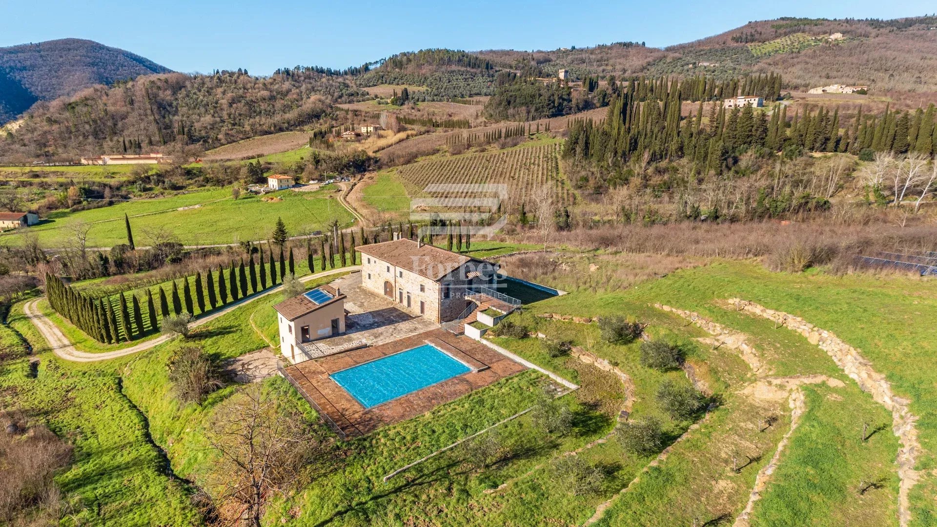 Esclusiva – A pochi minuti da Firenze, immersa nel verde delle dolci colline toscane, รจ in vendita questa magnifica colonica completamente ristrutturata, circondata da 8 ettari di terreno.