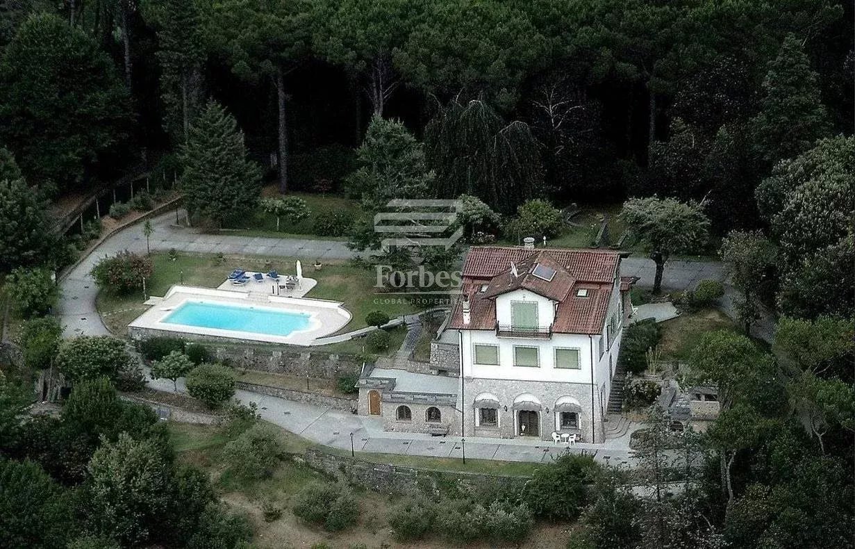 In Camaiore, on the Tuscan coast, stands this magnificent luxury villa for sale, enjoying a panoramic and secluded position in a wonderful hillside setting. The property is surrounded by a splendid lush park and about 9,000 square meters of land. The construction, dating back to the 1960s, spans three levels and has a total internal area of approximately 500 square meters. The wonderful portico and terrace are ideal spaces for outdoor dining and hosting guests. A careful and recent renovation has restored the villa to its former glory, equipping it with every contemporary comfort. On the ground floor, there is a spacious and bright living room with views over the valley, a kitchen with a built-in corner, a dining room with a fireplace, and a double bedroom with an en-suite bathroom. Moving to the first floor, we find the sleeping area, which includes a double bedroom with a terrace and bathroom, two bedrooms with access to the external loggia, and a bathroom. In the basement, there is a splendid cellar carved into the rock, a laundry area, a large utility room, and a technical room. A few steps down, there is an apartment consisting of a living area with kitchen, dining room, bathroom, storage room, and double bedroom, ideal for guests. High-quality details and finishes make the interiors and exteriors exclusive, where the large saltwater pool is a real highlight of this extraordinary property for sale, a perfect place for relaxing stays in the heart of the Tuscan countryside.