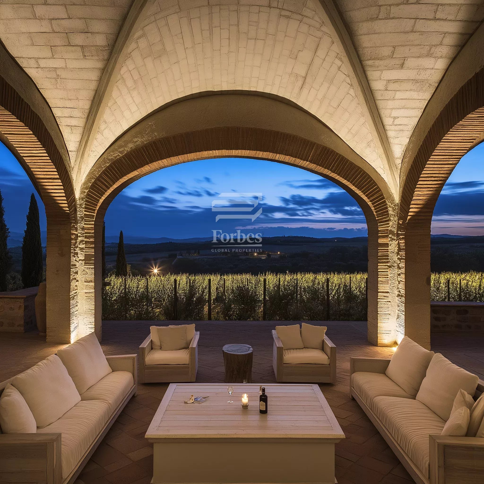 Das aus dem 15. Jahrhundert stammende Anwesen, das von rund 300 Hektar Weinbergen, Olivenhainen und Wäldern umgeben ist, besteht aus einer Hauptvilla, die komplett renoviert und mit Fresken versehen wurde, und einer zweiten Villa, die ebenfalls komplett renoviert und in 19 elegante Suiten unterteilt ist.