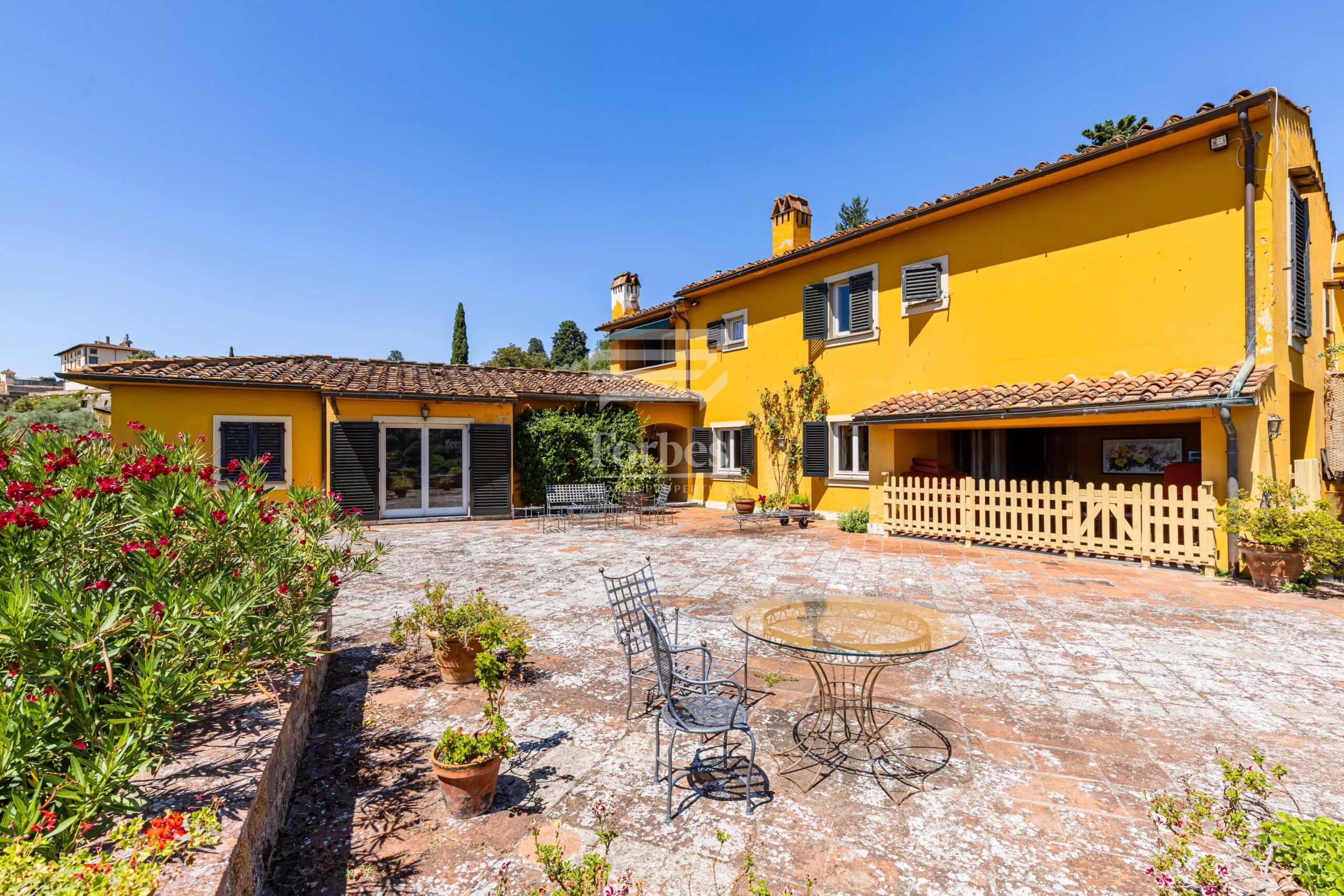 In one of the most prestigious and sought-after areas of Florence. a few steps from the famous Piazzale Michelangelo and only five minutes from the heart of the historic center. an extraordinary villa with swimming pool is for sale. an exclusive retreat surrounded by greenery and framed by the ancient city walls. The property covers 634 sqm distributed on two elegant levels. offering a total of 8 bedrooms and 6 bathrooms. The entrance leads into a majestic hall with imposing vaulted ceilings. giving it a timeless charm and an allure of refined monumentality. A large window gives a spectacular view of Florence. capturing the city’s most iconic monuments in a single glance. On the same floor are a bright dining room. a spacious kitchen with additional convivial area and a charming wine cellar. A sleeping area dedicated to guests. with two bedrooms both with en-suite bathrooms. completes the level. A dramatic staircase leads to the upper level. where the main sleeping area comes to life: five bedrooms with walk-in closets. three of which have en-suite bathrooms. a large study with bathroom and a refined entrance checkroom. The master suite. with exclusive balcony overlooking the hills. represents the intimate and privileged heart of the residence. All rooms are flooded with natural light. thanks to the villa’s excellent exposure. On the lower floor is the refined limonaia. perfect as an independent annex. ideal for guests or to create a private and cozy space. Outside. about 300 sqm of paved area hosts an elegant panoramic porch overlooking Piazzale Michelangelo and the Abbey of San Miniato al Monte. The private park of 15,000 sqm is an authentic Florentine Eden: swimming pool with solarium area. centuries-old olive grove and fruit trees frame this unique residence. Finally, the property has a large garage with direct access to the house and several uncovered parking spaces in the entrance square.
