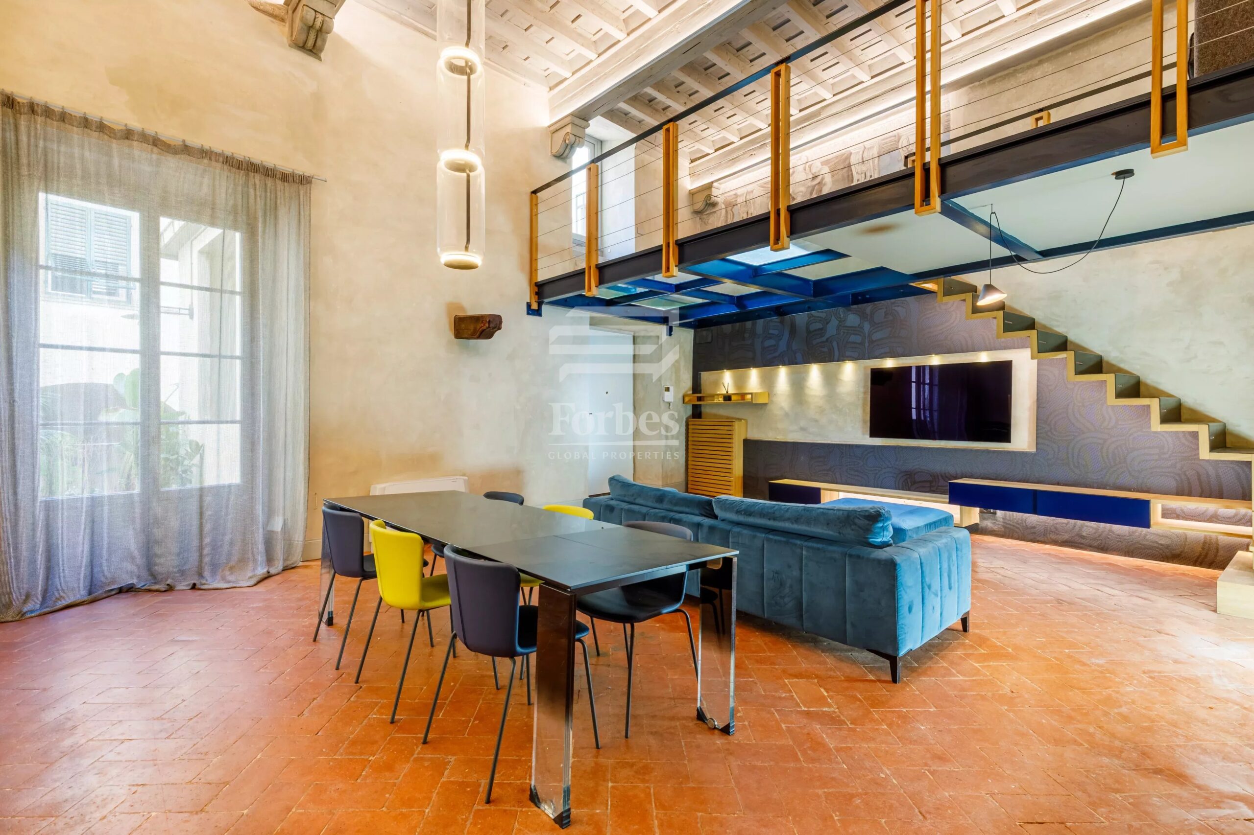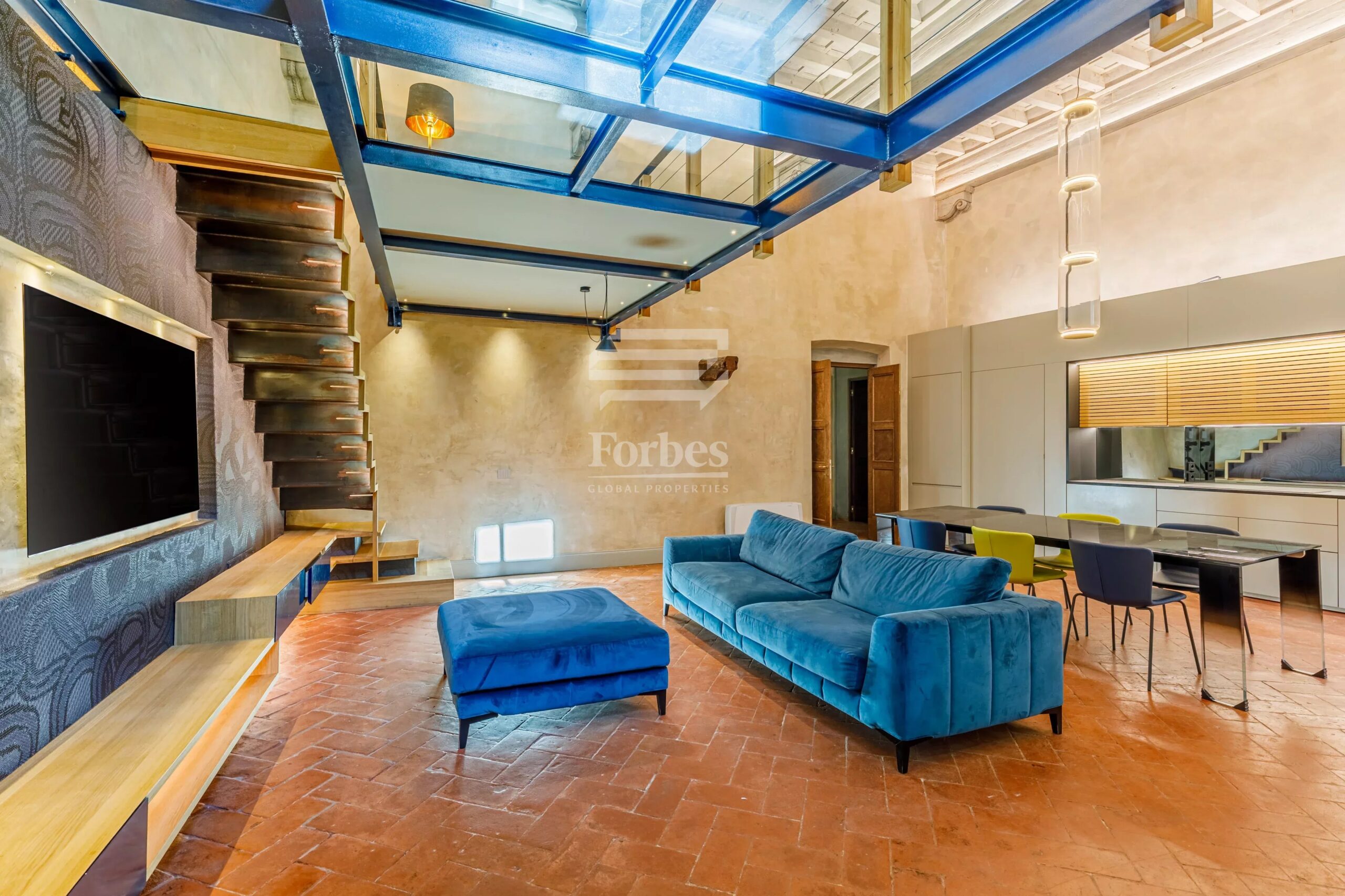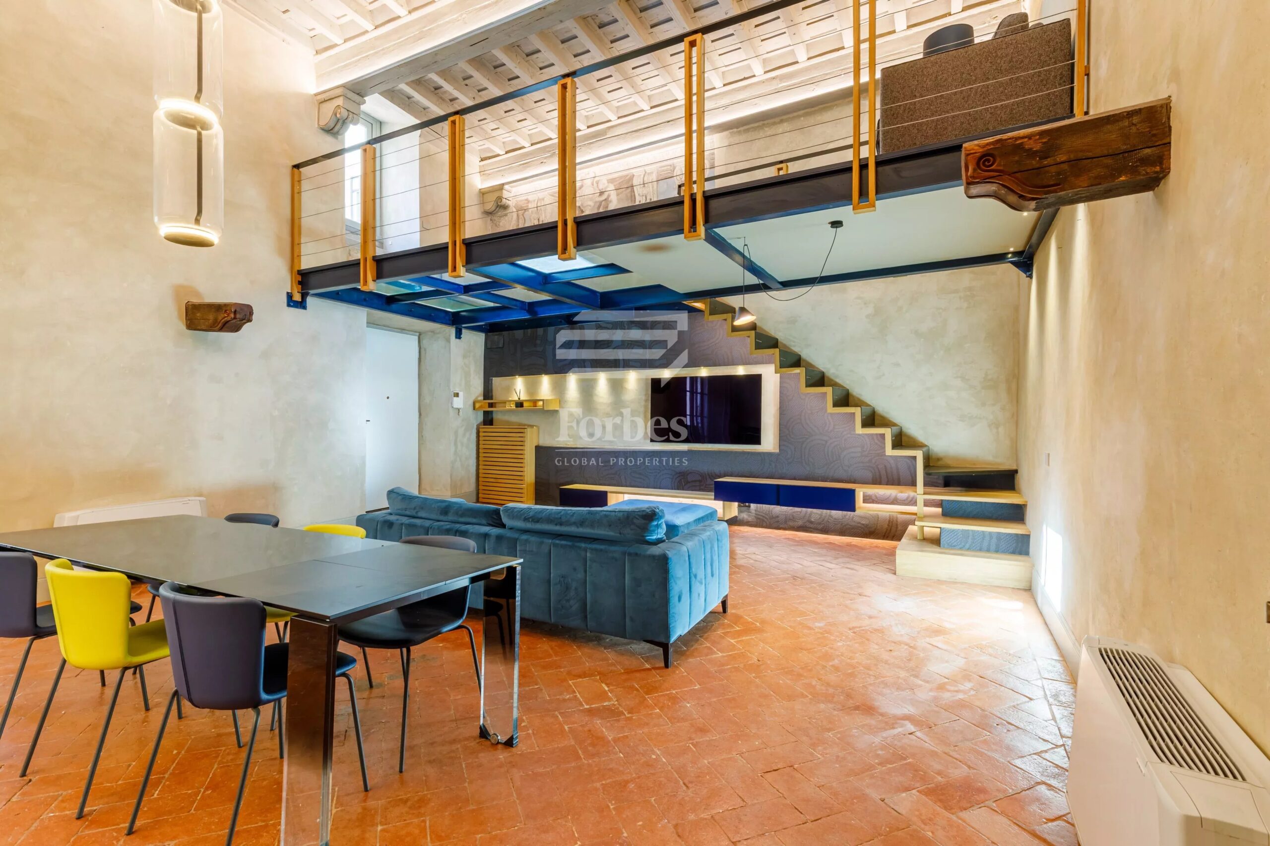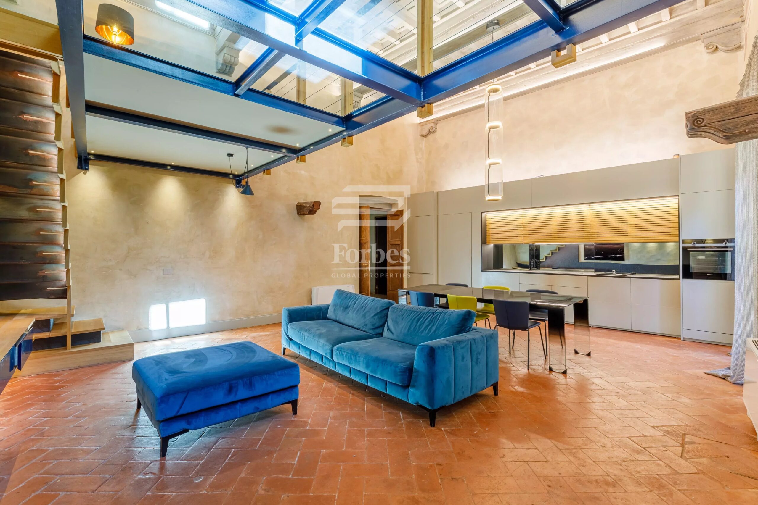 The apartment for sale consists of a large open plan living room with an open kitchen, perfect for hosting guests or living moments of relaxation. A refined staircase leads to a loft used as a studio, which overlooks an indoor living terrace, an intimate and reserved space to enjoy the Florentine climate.
