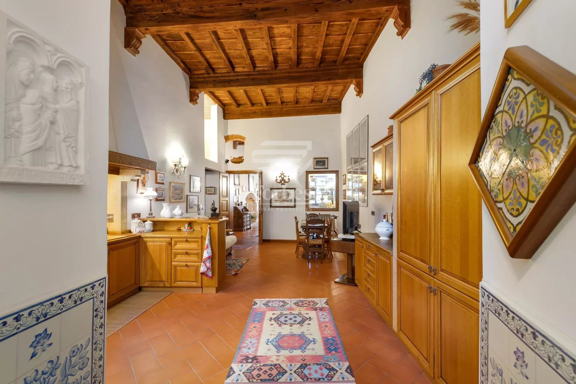 From the entrance, there is also access to a study that opens onto the second bedroom and a second bathroom. The exquisite finishes, from the terracotta to the exposed beams, from the stone staircase to the brick arches, evoke the most authentic Florentine architectural tradition.