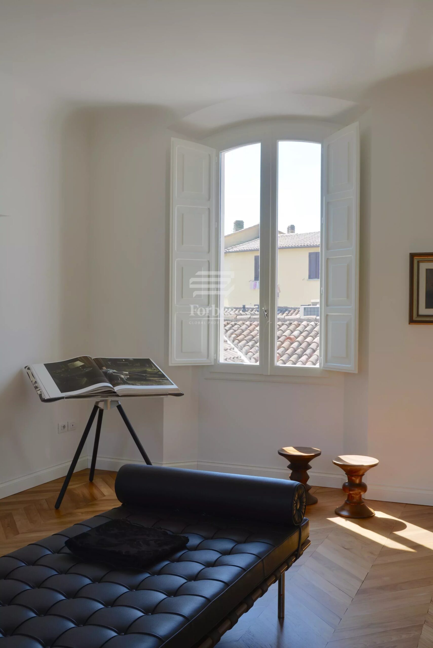 La résidence est enrichie de sols en teck massif, de murs en scagliola, de rampes en fer forgé, de radiateurs en fonte, de cheminées en marbre de Carrare et d’un escalier en pietra serena. Ces éléments d’époque dialoguent harmonieusement avec des équipements modernes tels que des sanitaires design, des robinetteries haut de gamme et des systèmes technologiques de pointe. L’agencement des espaces permet également une grande flexibilité, avec la possibilité de les personnaliser en fonction des besoins.
