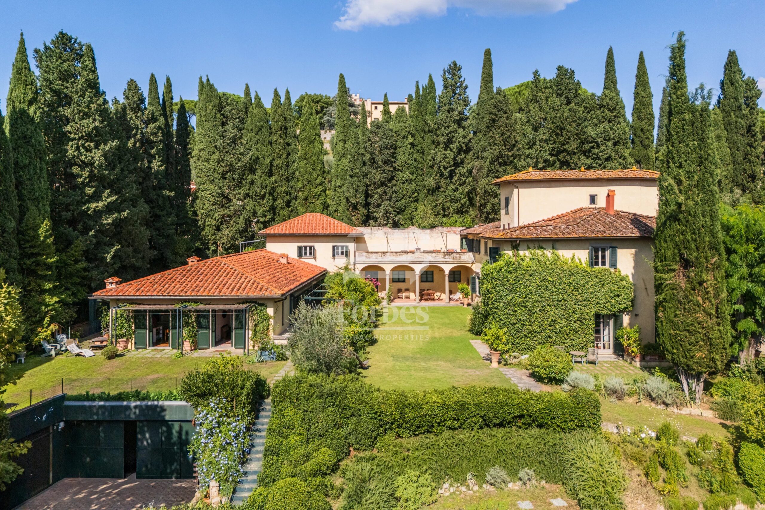 Immersa in un ettaro di terreno completamente recintato e circondato da alti cipressi, la residenza offre un’oasi di pace e riservatezza assoluta a pochi minuti dal centro di Firenze. Un viale fiancheggiato da alberi secolari conduce a un ampio piazzale privato davanti all’edificio principale.