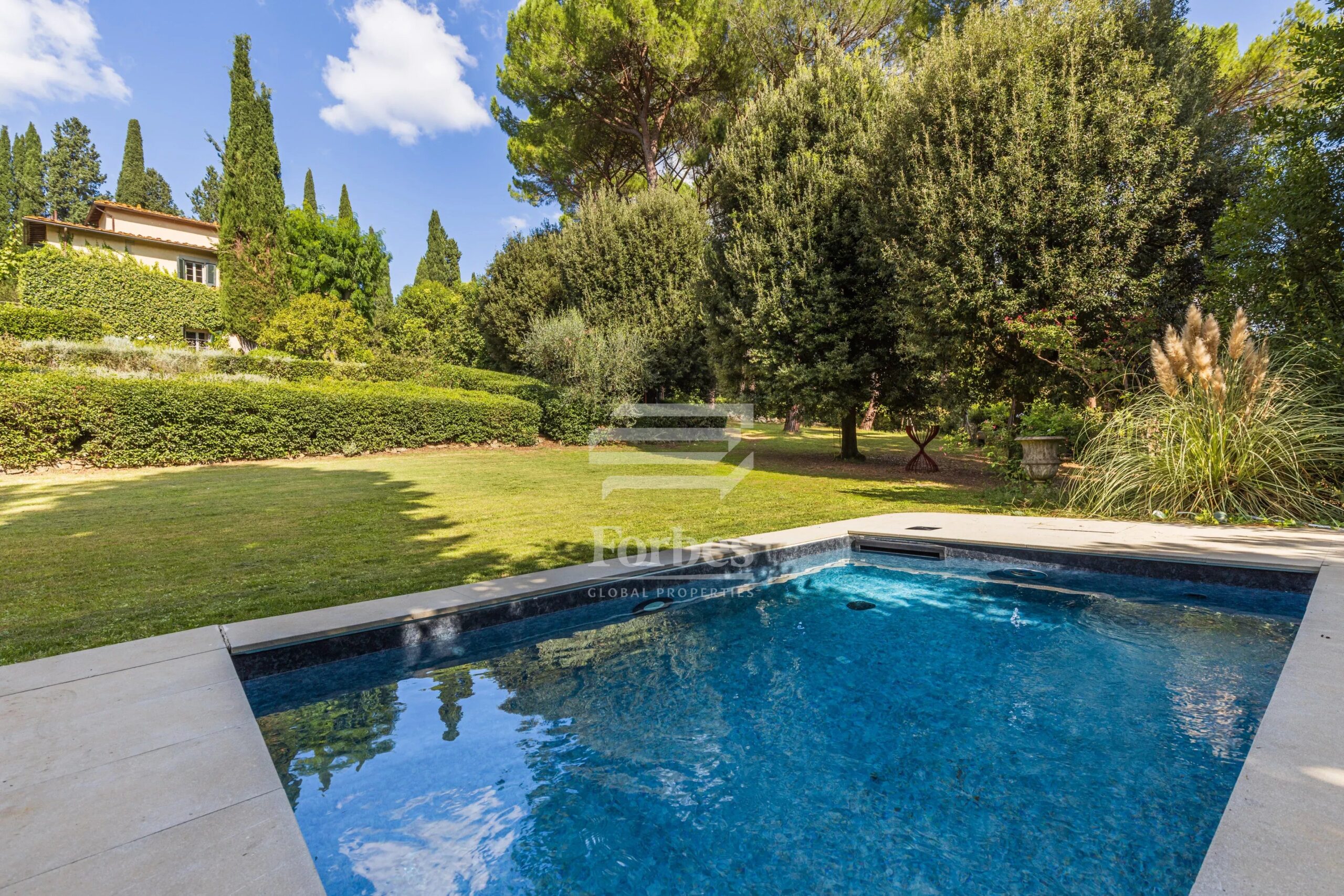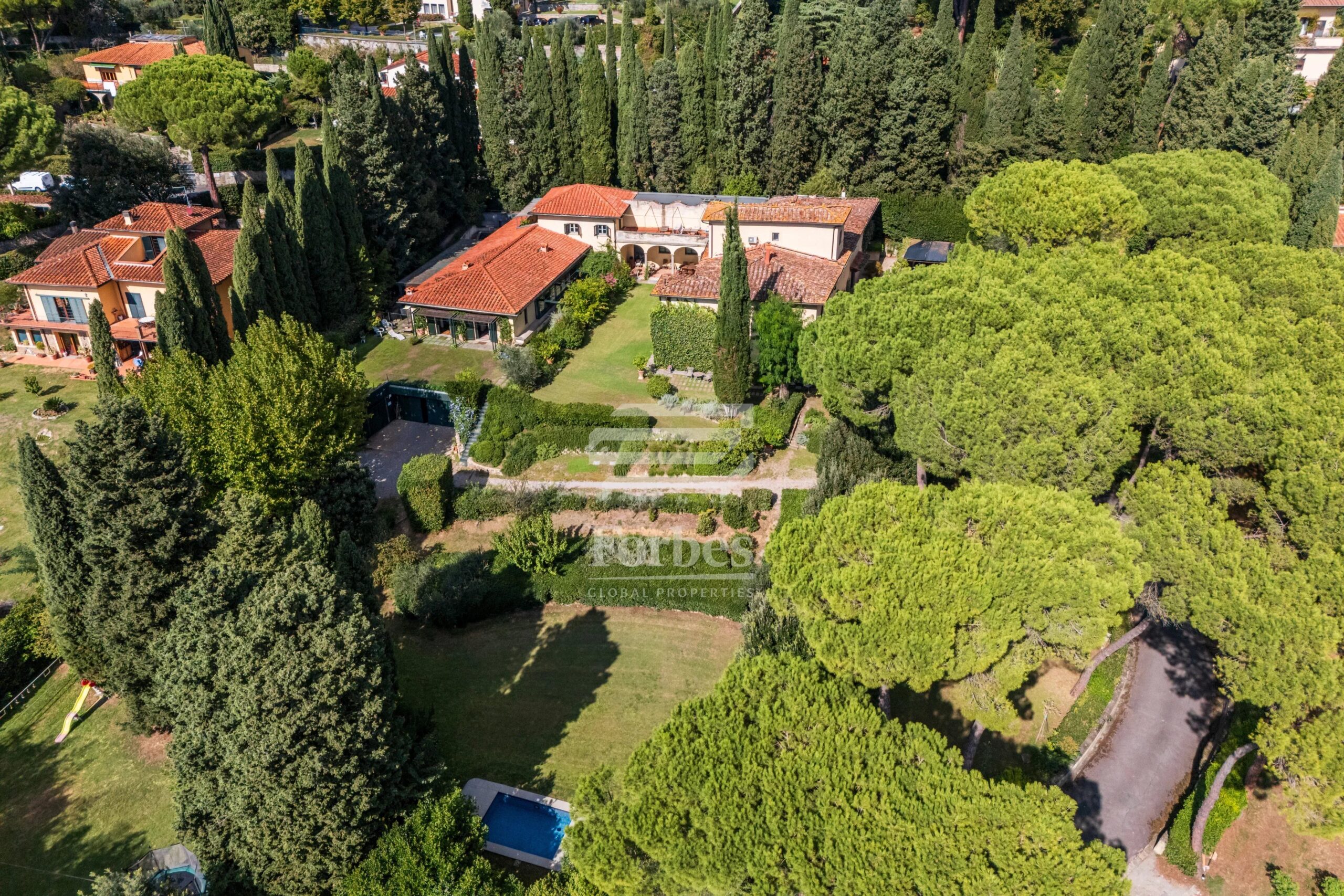 Immersed in a one-hectare fully fenced land surrounded by tall cypresses, the residence offers an oasis of peace and absolute privacy just minutes from the center of Florence. A driveway lined with centuries-old trees leads to a large private square in front of the main building.