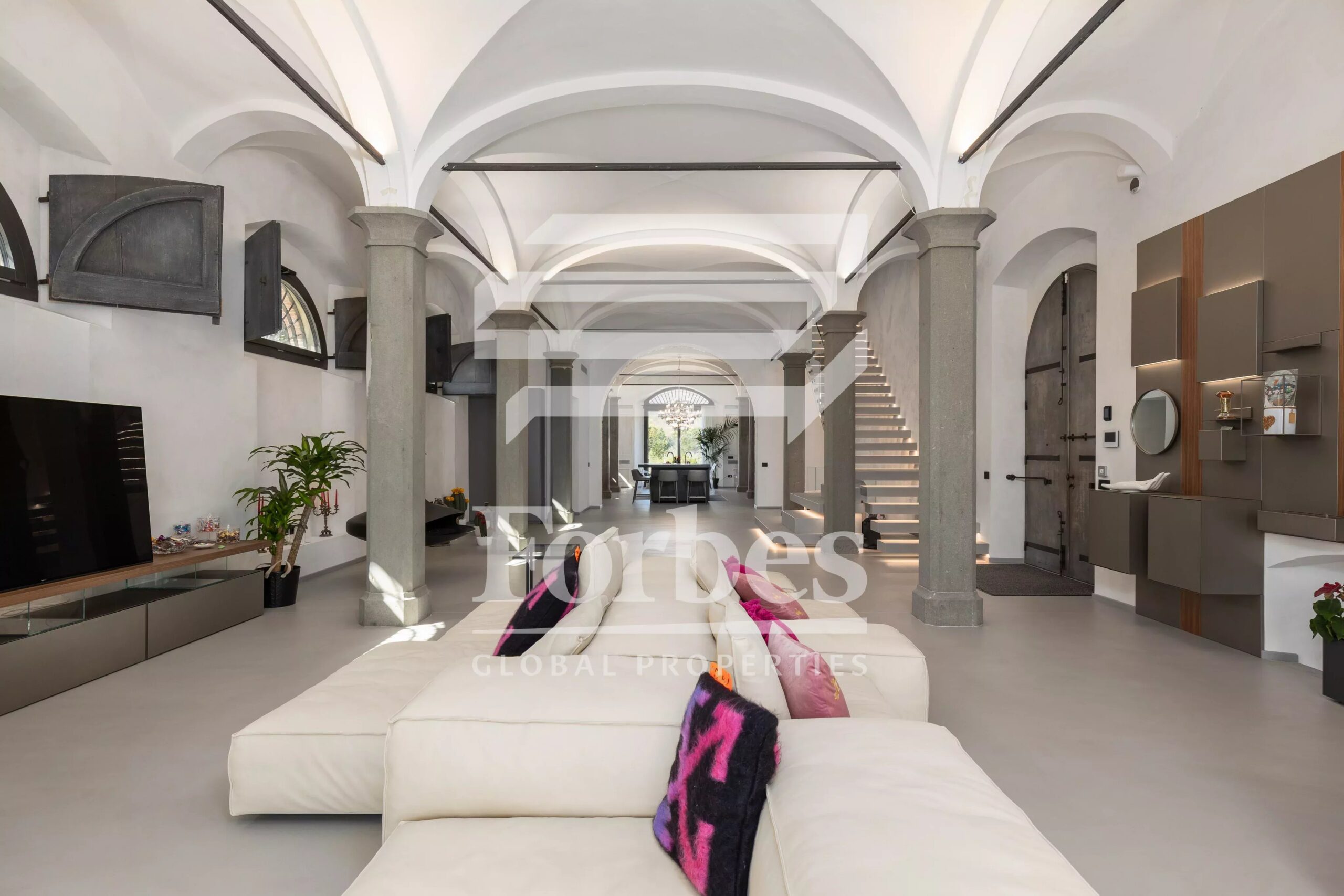 On the upper floor, reached by a striking staircase, is an 80-square-meter master bedroom with a dressing room and en-suite bathroom, as well as two additional bedrooms, each with an en-suite bathroom. The same floor also houses a second detached apartment for sale, measuring 75 sq m, which includes a lofted living room, kitchenette and sleeping area with en-suite bathroom.